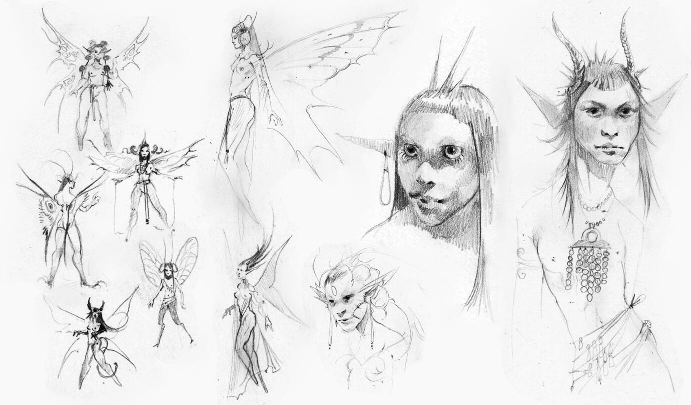 Fairy beings exist on a plane different from ours, but when they walk among us, they can take on elven or animal forms. They are organized around a monarchy, in which elves sometimes participate. Lesser fairies have a childlike appearance blended with natural elements and delight in teasing beings from the material plane.